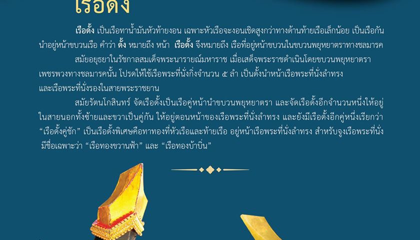 เรือดั้ง เป็นเรือทาน้ำมันหัวท้ายงอน เฉพาะหัวเรือจะงอนเชิดสูงกว่าทางด้านท้ายเรือเล็กน้อย เป็นเรือกันนำอยู่หน้าขบวนเรือ คำว่า ดั้ง หมายถึง หน้า เรือดั้ง จึงหมายถึง เรือที่อยู่หน้าขบวนในขบวนพยุหยาตราทางชลมารคสมัยอยุธยาในรัชกาลสมเด็จพระนารายณ์มหาราช เมื่อเสด็จพระราชดำเนินโดยขบวนพยุหยาตราเพชรพวงทางชลมารคนั้น โปรดให้ใช้เรือพระที่นั่งกิ่งจำนวน 5 ลำ เป็นดั้งนำหน้าเรือพระที่นั่งลำทรง และเรือพระที่นั่งรองในสายพระราชยานสมัยรัตนโกสินทร์ จัดเรือดั้งเป็นเรือคู่หน้านำขบวนพยุหยาตรา และจัดเรือดั้งอีกจำนวนหนึ่งให้อยู่ในสายนอกทั้งซ้ายและขวาเป็นคู่กัน ให้อยู่ตอนหน้าของเรือพระที่นั่งลำทรง