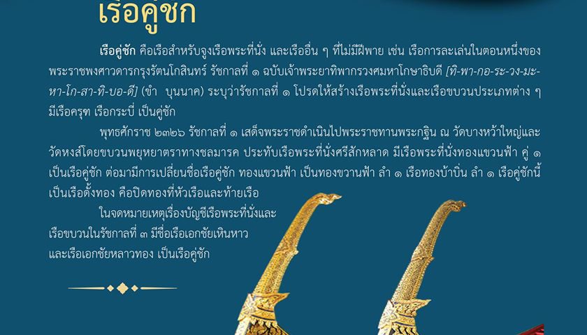เรือคู่ชัก คือเรือสำหรับจูงเรือพระที่นั่ง และเรืออื่นๆ ที่ไม่มีฝีพาย เช่น เรือการละเล่นในตอนหนึ่งของพระราชพงศาวดารกรุงรัตนโกสินทร์ รัชกาลที่ 1 ฉบับเจ้าพระยาทิพากรวงศมหาโกษาธิบดี [ทิ-พา-กอ-ระ-วง-มะ-หา-โก-สา-ทิ-บอ-ดี] (ขำ บุนนาค) ระบุว่ารัชกาลที่ 1 โปรดให้สร้างเรือพระที่นั่งและเรือขบวนประเภทต่างๆ มีเรือครุฑ เรือกระบี่ เป็นคู่ชัก