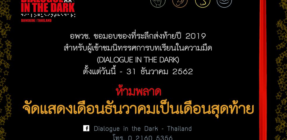 องค์การพิพิธภัณฑ์วิทยาศาสตร์แห่งชาติ (อพวช.) จัดกิจกรรมส่งท้าย นิทรรศการ “บทเรียนในความมืด : Dialogue in the Dark” นิทรรศการจากประเทศเยอรมนี ที่นำมาจัดแสดงร่วม 10 ปี ณ จัตุรัสวิทยาศาสตร์ อพวช. ชั้น 4 อาคารจัตุรัสจามจุรี สามย่าน ซึ่งจะจัดแสดงในเดือนธันวาคม 2562 นี้เป็นเดือนสุดท้าย พร้อมมอบของที่ระลึกสุดพิเศษ! จากนิทรรศการฯ ถือเป็นการขอบคุณและส่งมอบของขวัญปีใหม่ให้กับผู้เข้าชม เริ่มตั้งแต่วันนี้ – 31 ธันวาคม 2562