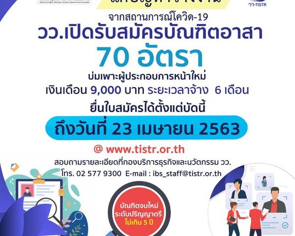 กระทรวงการอุดมศึกษา วิทยาศาสตร์ วิจัยและนวัตกรรม โดย สถาบันวิจัยวิทยาศาสตร์และเทคโนโลยีแห่งประเทศไทย (วว.) ร่วมพัฒนาสังคมและเศรษฐกิจ ช่วยแก้ปัญหาการว่างงานจากสถานการณ์โควิด-19 เปิดรับสมัครบัณฑิตอาสาจำนวน 70 อัตรา ตั้งแต่บัดนี้ถึงวันที่ 23 เมษายน 2563 ระบุผู้ผ่านการคัดเลือกจะได้รับเงินเดือน 9,000 บาทต่อราย ในระยะเวลา 6 เดือน เริ่มปฏิบัติงานวันที่ 1 พฤษภาภาคม 2563 เป็นต้นไป