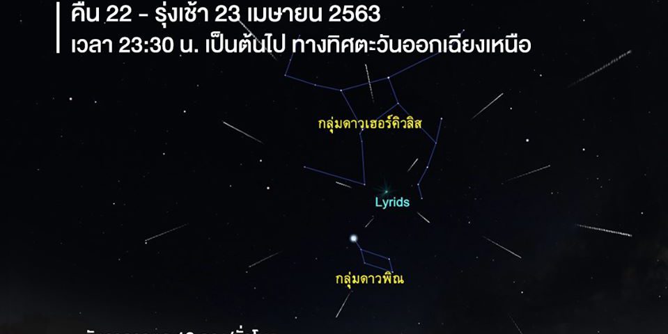 #ฝนดาวตกไลริดส์ เริ่มสังเกตุได้ตั้งแต่เวลาประมาณ 23:30 น. ของวันที่ 22 เมษายน 2563 ไปจนถึงรุ่งเช้าของวันที่ 23 เมษายน 2563 ทางทิศตะวันออกเฉียงเหนือ บริเวณกลุ่มดาวพิณ คาดว่าจะมีอัตราการตกสูงสุดเฉลี่ย 18 ดวงต่อชั่วโมง และในค่ำคืนนี้ยังไร้แสงจันทร์รบกวน เหมาะแก่การสังเกตการณ์เป็นอย่างยิ่ง สามารถสังเกตการณ์ได้ทั่วประเทศหากฟ้าใสไร้เมฆ แต่ก็ต้องอยู่ในบริเวณที่มืดสนิทปราศจากแสงรบกวน ดังนั้นบ้านของใครที่มีมลภาวะทางแสงน้อย ถือว่าโชดดีมากเลยครับ