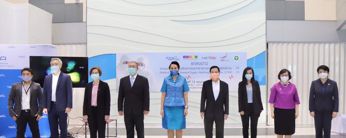 วันที่ 12 พฤษภาคม 2563 กระทรวงการอุดมศึกษา วิทยาศาสตร์ วิจัยและนวัตกรรม (อว.) โดย สำนักงานพัฒนาวิทยาศาสตร์และเทคโนโลยีแห่งชาติ (สวทช.) ร่วมมือกับบริษัท เน็ตเบย์ จำกัด (มหาชน) เครือข่ายโรงพยาบาล กลุ่มสถาบันแพทยศาสตร์แห่งประเทศไทย (UHosNet) และสำนักงานปลัดกระทรวงสาธารณสุข จัดแถลงข่าว “ระบบบริหารความต้องการอุปกรณ์ทางการแพทย์สู้ภัยโควิด–19 (Medical Devices Demand-Supply Matching for COVID-19)” แพลตฟอร์มเพื่อการบริจาค จับคู่ความต้องการ การบริหารจัดการอุปกรณ์ทางการแพทย์ให้มีประสิทธิภาพและรวดเร็ว ในภาวะวิกฤตโควิด–19 ณ โถงทาวเวอร์ C ชั้น 1 อาคารกลุ่มนวัตกรรม 2 (INC2) อุทยานวิทยาศาสตร์ประเทศไทย