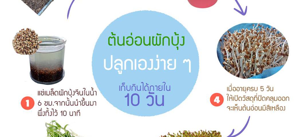 สำหรับการปลูกต้นอ่อนผักบุ้ง ที่สามารถเก็บมารับประทานได้หรือนำไปจำหน่ายได้ภายใน 10 วัน เริ่มต้นด้วยการเตรียมวัสดุอุปกรณ์ ได้แก่ (1) เมล็ดผักบุ้งหาซื้อได้ตามร้านจำหน่ายเมล็ดพันธุ์หรือร้านค้าจำหน่ายวัสดุการเกษตร (2) ดินผสมพร้อมปลูก (3) กระบะ/ กระถาง หรือตะกร้าปลูก ขนาดเหมาะสมกับพื้นที่ (4) ผ้าขนหนู และ (5) น้ำ