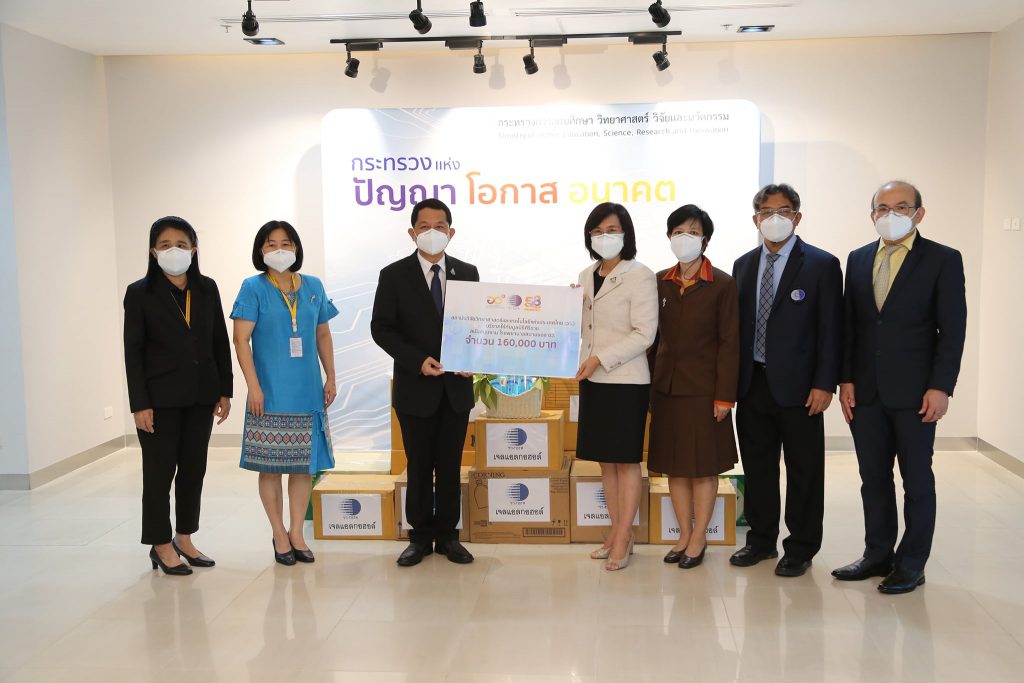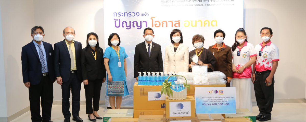 14 พฤษภาคม 2564 ณ ห้องโถงชั้น 1 อาคารพระจอมเกล้า สป.อว. / ศ.ดร.นพ.สิริฤกษ์ ทรงศิวิไล ปลัดกระทรวงการอุดมศึกษา วิทยาศาสตร์ วิจัยและนวัตกรรม (อว.) รับมอบเงินสนับสนุนและของบริจาคจาก ศ.(วิจัย) ดร.ชุติมา เอี่ยมโชติชวลิต ผู้ว่าการสถาบันวิจัยวิทยาศาสตร์และเทคโนโลยีแห่งประเทศไทย (วว.) จำนวนเงิน 160,000 บาทพร้อมทั้งเจลแอลกอฮอล์ และคณะภาคเอกชน ผู้บริหาร บริษัท มารีอา โปรดักส์ จำกัด, บริษัทมาริช โปรดักส์ จำกัด มอบหน้ากากอนามัยแบบ 3 ดี สำหรับทำความสะอาดฆ่าเชื้อ โดยเงินสนับสนุนและของบริจาคดังกล่าวจะมอบให้กับมูลนิธิศิริราช เพื่อสนับสนุนงาน โรงพยาบาลสนามของ อว. ต่อไป