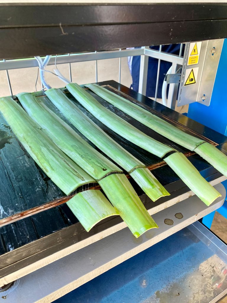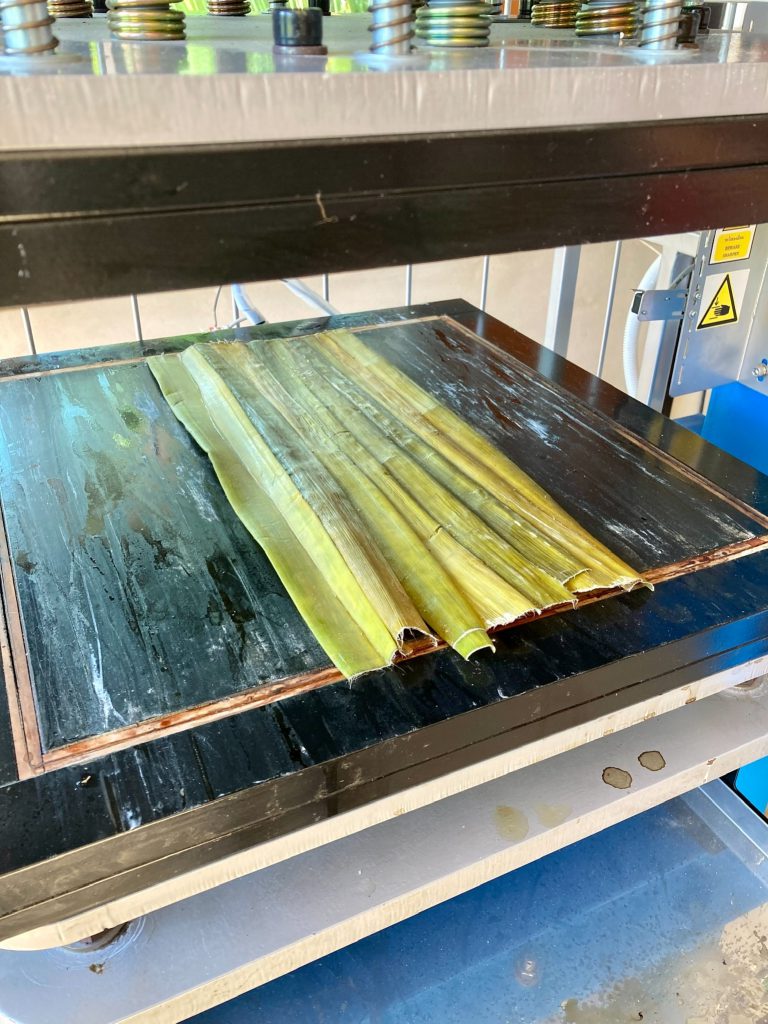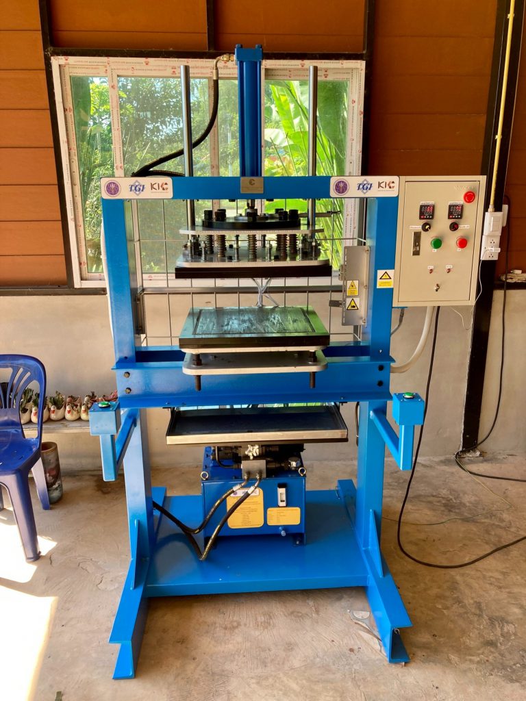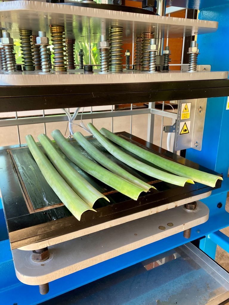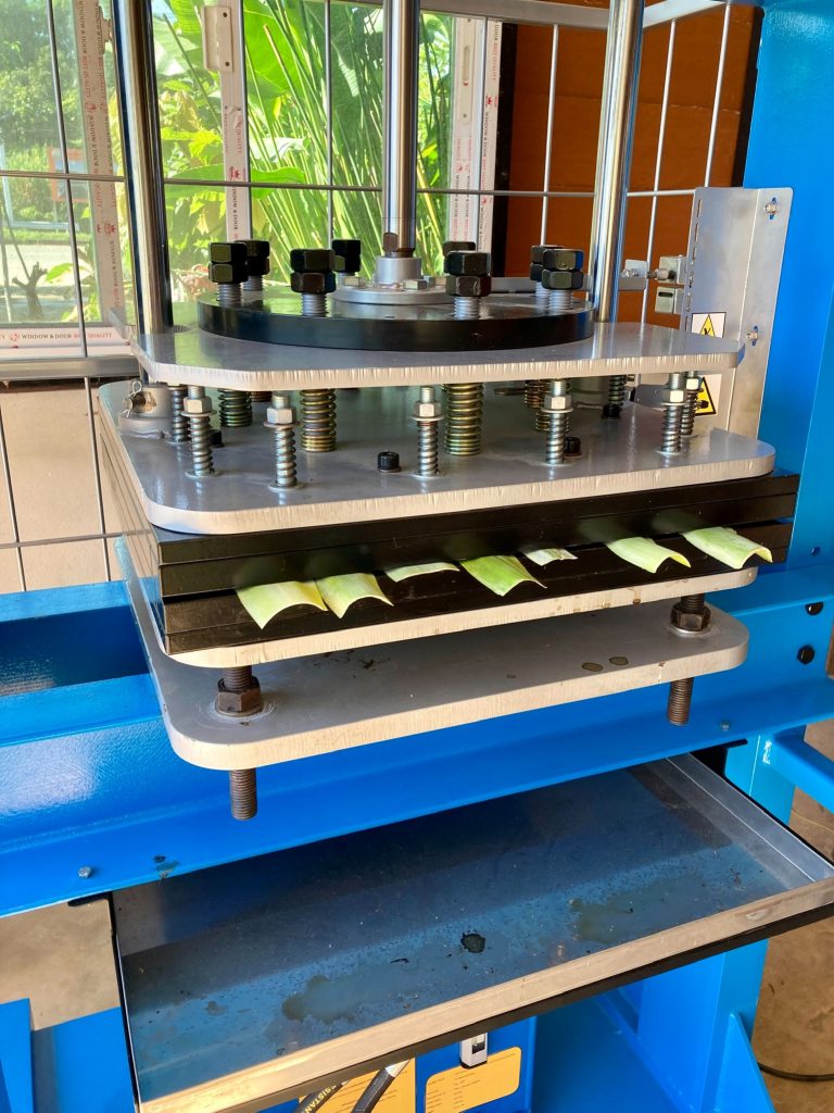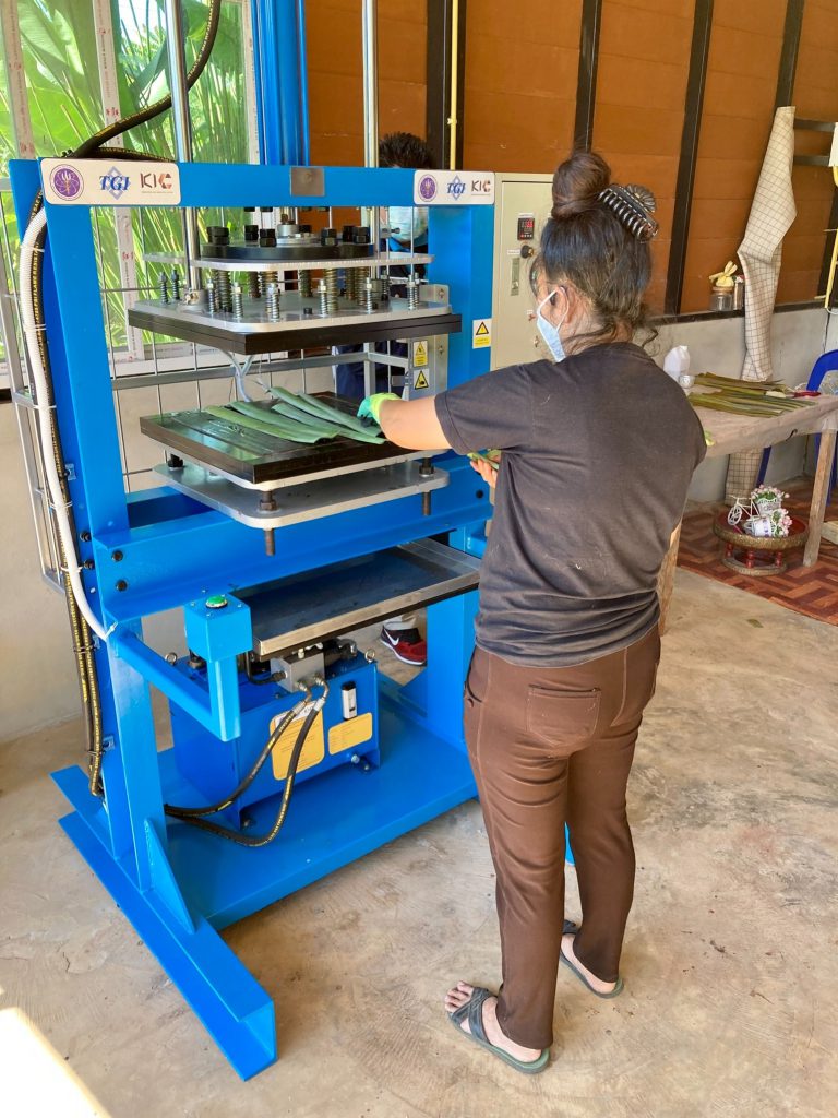 ณ วิสาหกิจชุมชนกลุ่มเสื้อผ้าและเครื่องแต่งกาย A&R ตำบลห้วยซ้อ อำเภอเชียงของ จังหวัดเชียงราย โดยเครื่องจักรฯ ที่พัฒนาขึ้น ใช้ในการขึ้นรูปใบสับปะรดอบแห้งที่ได้ทำการทากาวประสานเข้าไว่ด้วยกัน โดนตัวเครื่องจะทำการกดทับเป็นแผ่น ไม่บิดงอ และตัวกาวแห้งไม่ไหลออกมา ทำให้ได้แผ่นใบสับปะรดที่ประสานเรียบสวยงามมีคุณภาพเท่ากันทุกแผ่น โดยเครื่องจักมีกำลังการผลิตที่ 10 แผ่นต่อชั่วโมง ตัวแผ่นมีขนาดใหญ่ที่สุดที่ 40×40 ซม.