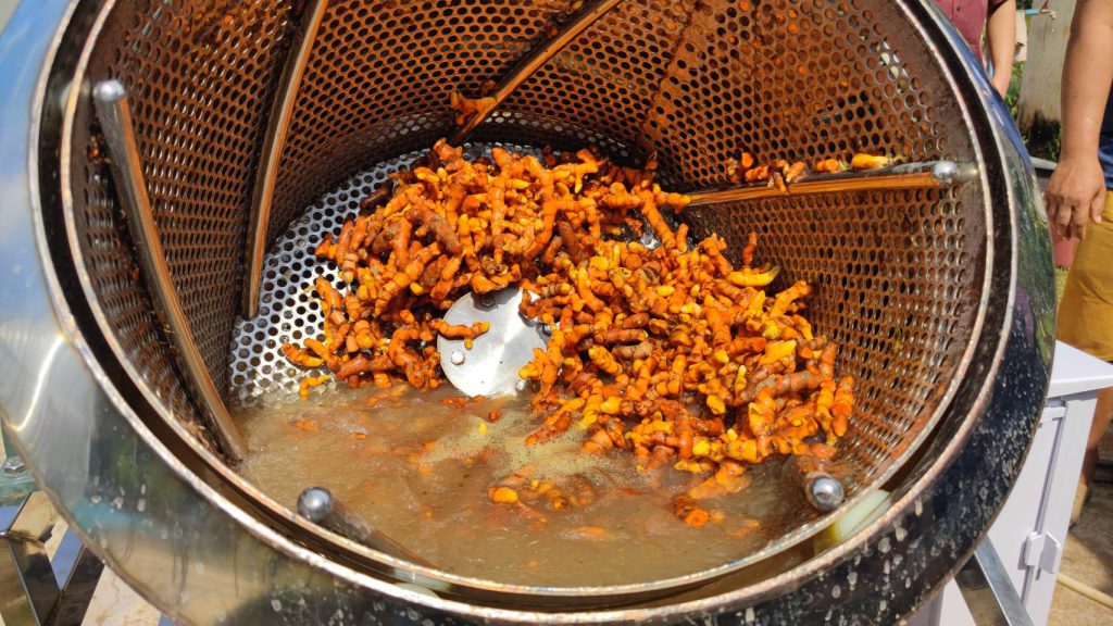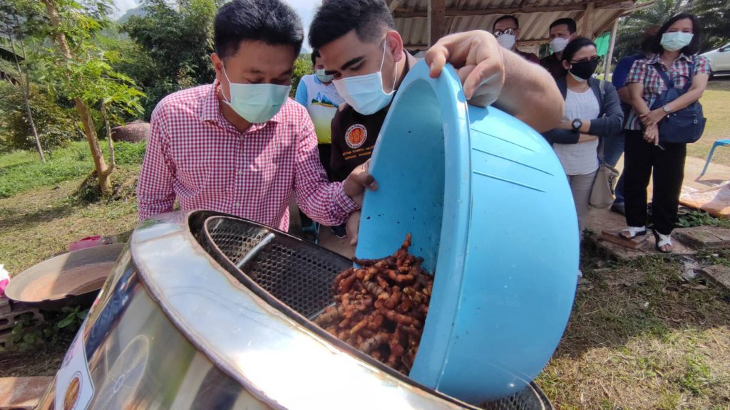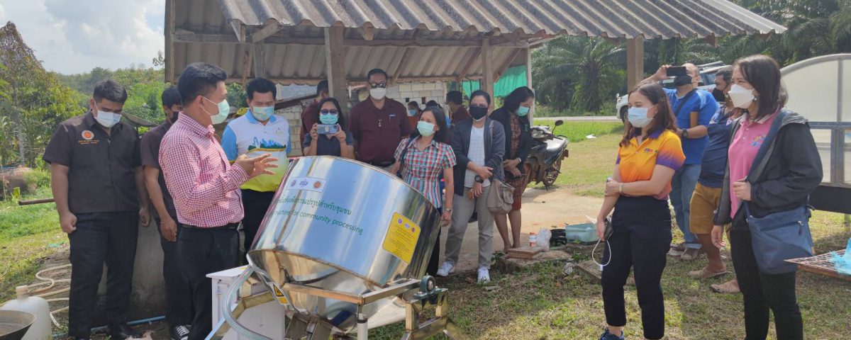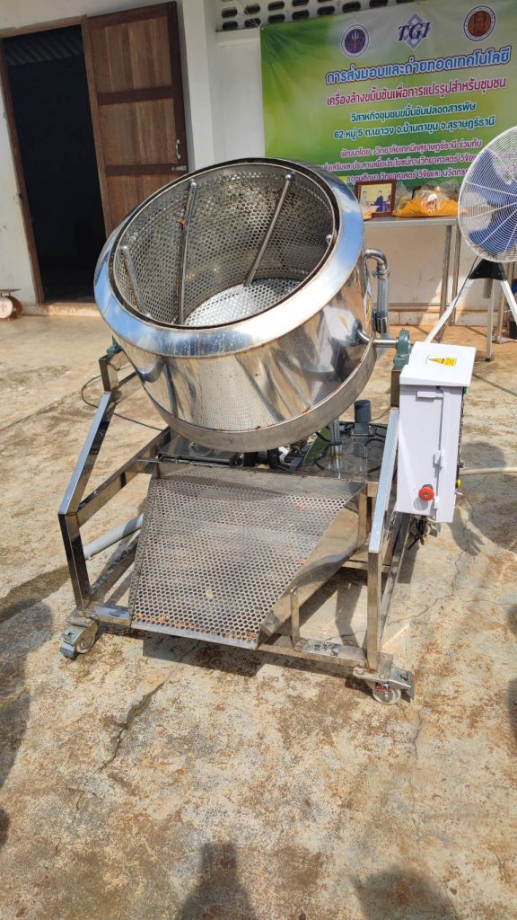 ลงพื้นที่ติดตามผลการพัฒนาเครื่องล้างขมิ้นชันเพื่อการแปรรูปสำหรับชุมชน ที่ติดตั้งเพื่อทดสอบการใช้งาน ณ วิสาหกิจชุมชนขมิ้นชันปลอดสารพิษ ต.เขาวง อ.บ้านตาขุน จ.สุราษฎร์ธานี พัฒนาโดย นายจิระพงศ์ อ่อนหนู วิทยาลัยเทคนิคสุราษฎร์ธานี และคณะ ภายใต้ โครงการพัฒนาต้นแบบเครื่องจักร เครื่องมือและอุปกรณ์ เพื่อการผลิตระดับชุมชน โดยเครื่องที่พัฒนาใช้ในการล้างขมิ้นชันก่อนนำไปแปรรูป ลดระยะเวลาในการล้าง เพิ่มกำลังการผลิต มีระบบหมุนเวียนน้ำ ใช้งานง่ายทดแทนการล้างแบบเดิมที่ต้องใช้แรงงานหลายคน และเปลืองน้ำมาก ลดกระบวนการจาก 5 ขั้นตอน เหลือขั้นตอนเดียว