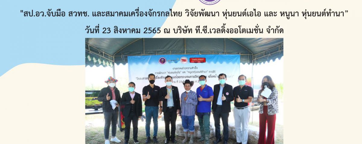 วันที่ 23 สิงหาคม 2565 เจ้าหน้าที่กองส่งเสริมและประสานเพื่อประโยชน์ทางวิทยาศาสตร์ วิจัยและนวัตกรรม (กปว.) ร่วมกันแถลงข่าวการพัฒนา หุ่นยนต์เอไอ และหนูนา หุ่นยนต์ทำนา ซึ่งพัฒนาโดย บริษัท ที.ซี.เวลดิ้งออโตเมชั่น จำกัด ซึ่งเป็นการสนับสนุนงบประมาณภายใต้โครงการพัฒนาสร้างเครื่องจักรต้นแบบด้วยกระบวนการวิศวกรรมเพื่อการสร้างสรรค์คุณค่า ประจำปีงบประมาณ พ.ศ. 2564