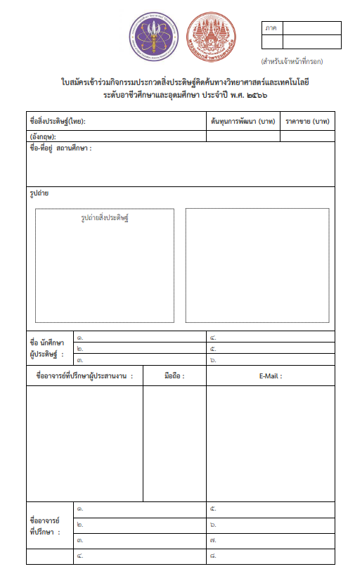 ด้วยกระทรวงการอุดมศึกษา วิทยาศาสตร์ วิจัยและนวัตกรรม ร่วมกับมหาวิทยาลัยเทคโนโลยี พระจอมเกล้าพระนครเหนือ มีความประสงค์ที่จะส่งเสริมการประดิษฐ์คิดค้นทางวิทยาศาสตร์ และเทคโนโลยี ที่มีคุณค่าของนิสิต/นักศึกษาระดับอาชีวศึกษาและอุดมศึกษา จึงจัดกิจกรรม การจัดประกวดสิ่งประดิษฐ์คิดค้น ทางวิทยาศาสตร์และเทคโนโลยีระดับอาชีวศึกษาและอุดมศึกษา ประจำปี พ.ศ. 2566 โดยสิ่งประดิษฐ์ฯ ที่ส่ง เข้าประกวด ต้องเป็นสิ่งประดิษฐ์ที่เป็นประโยชน์ต่อสังคม สามารถนำไปพัฒนาต่อยอดเชิงพาณิชย์ได้ และเป็นผลงาน ของนิสิตนักศึกษาระดับอาชีวศึกษาและอุดมศึกษาเท่านั้น ผู้สนใจสามารถส่งใบสมัคร หรือสอบถามข้อมูลได้ในวันและเวลาทำการ ตามรายละเอียด ดังนี้