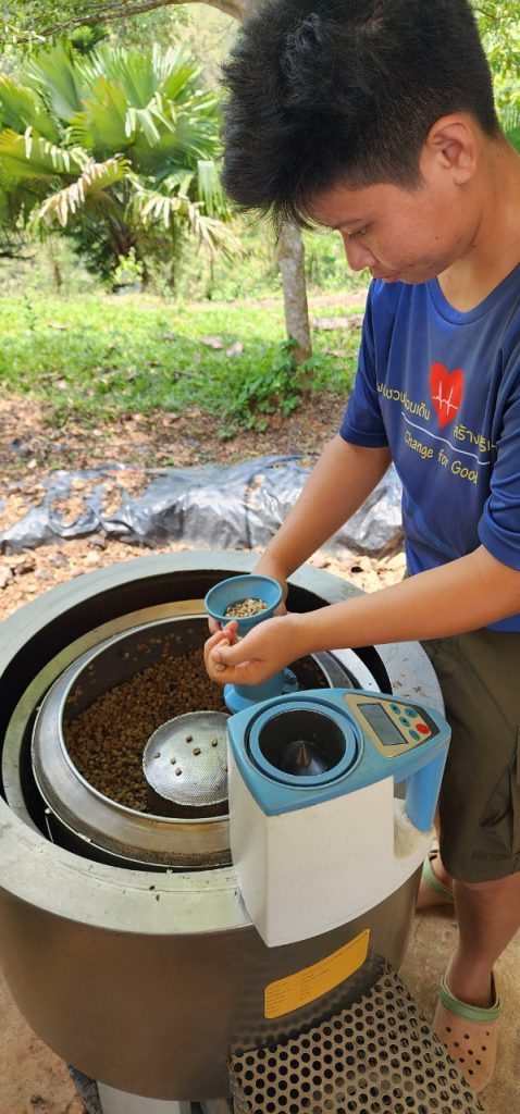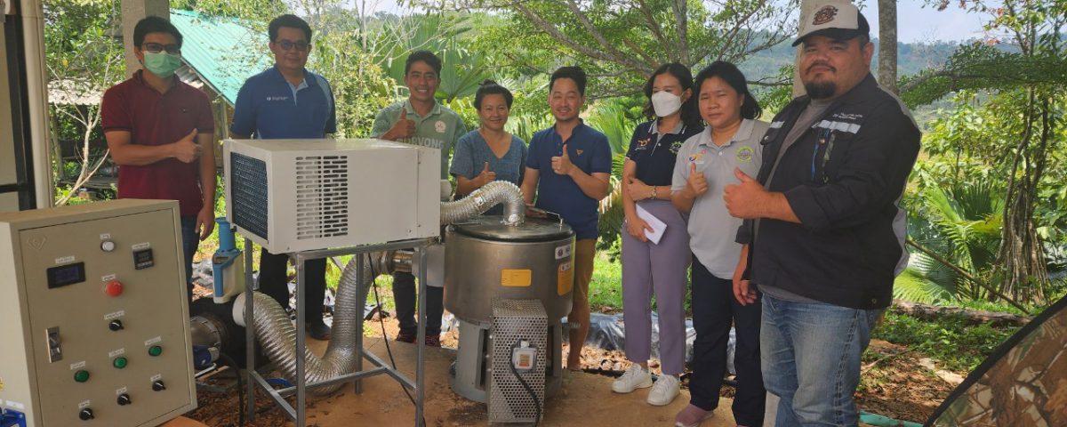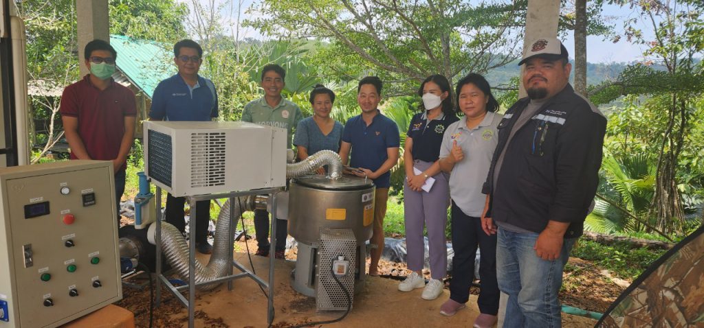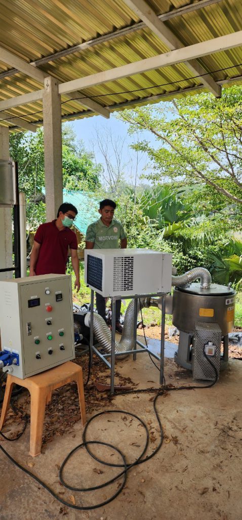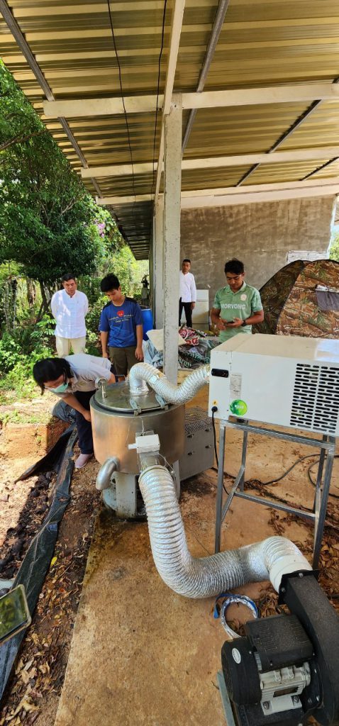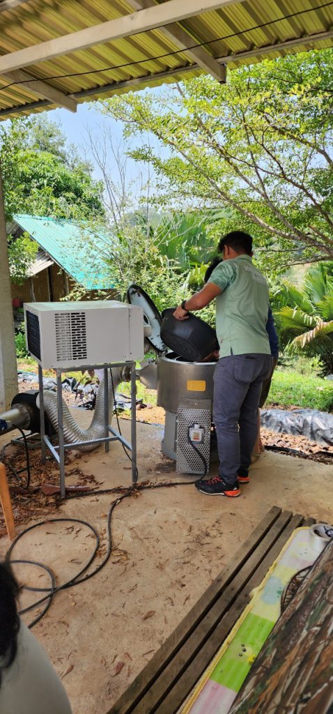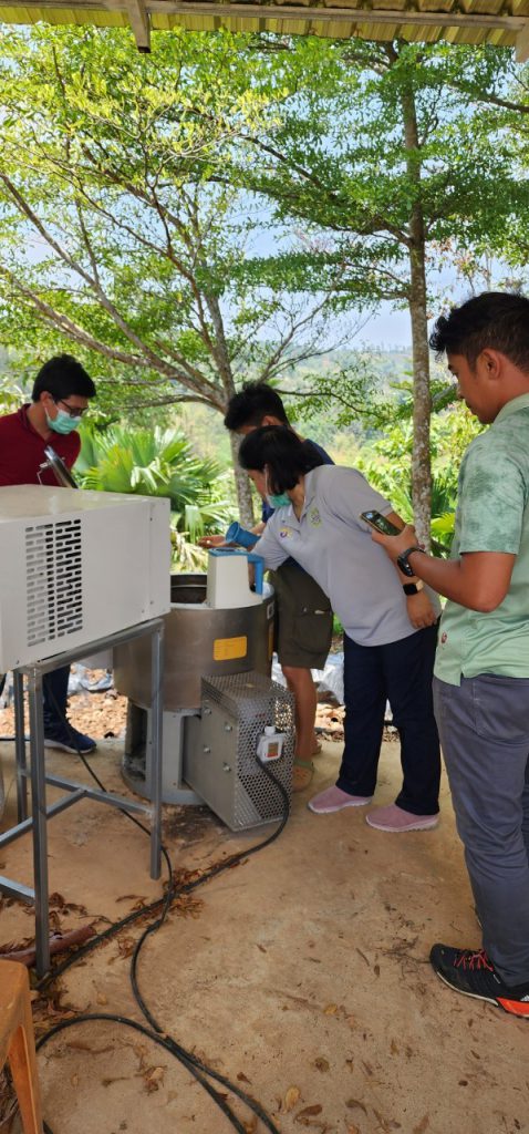 19 พฤษภาคม 2566 เวลา 11.00 น. เจ้าหน้าที่กองส่งเสริมและประสานเพื่อประโยชน์ทางวิทยาศาสตร์ วิจัยและนวัตกรรม ร่วมกับ สถาบันไทย-เยอรมัน ลงพื้นที่เพื่อส่งมอบ พัฒนาโดย อจ. ปิยะพงษ์ สิงห์บัวหน่วยงาน มหาวิทยาลัยวงษ์ชวลิตกุล ภายใต้โครงการพัฒนาต้นแบบเครื่องจักร เครื่องมือและอุปกรณ์ เพื่อการผลิตระดับชุมชน ที่ติดตั้งเพื่อใช้งาน ณ วิสาหกิจชุมชนลองเลย ตำบลแสงภา อำเภอนาแห้ว จังหวัดเลย เครื่องดังกล่าวพัฒนาขึ้นเพื่อช่วยลดความชื้นของเมล็ดกาแฟ เพื่อนำไปผ่านกระบวนการคั่วเมล็ดกาแฟต่อไป มีกระบวนการทำงานของเครื่อง 2 ส่วนหลักๆ ที่ทำงานไปพร้อมกัน คือ ส่วนการสลัดน้ำ และส่วนการอบเพื่อลดความชื้น อัตราการทำงานอยู่ที่ 15 กิโลกรัมต่อรอบ ใช้อุณหภูมิและเวลาอยู่ที่ 40-50 องศาเซลเซียส และ 20 นาที ตามลำดับ โดยเครื่องดังกล่าวช่วยลดความชื้นของเมล็ดกาแฟประมาณ 60 เปอร์เซ็นต์ และลดระยะเวลาในการนำเมล็ดกาแฟไปตากประมาณ 3 วัน