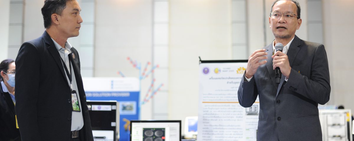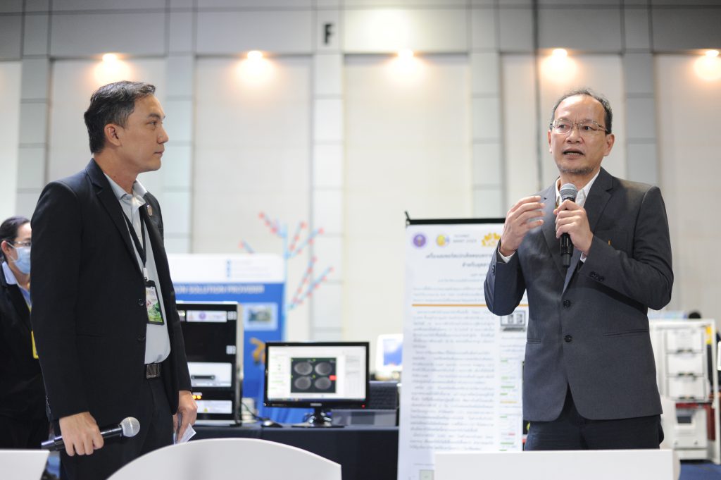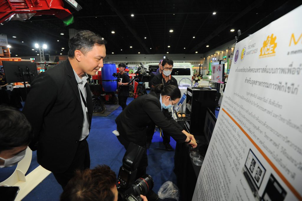 โดยผู้แทนหน่วยงานนำเสนอผลงาน ได้แก่ คุณจิรวัฒน์ วงษ์สมาน นักวิเคราะห์นโยบายและแผนชำนาญการ กองส่งเสริมและประสานเพื่อประโยชน์ทางวิทยาศาสตร์ วิจัยและนวัตกรรม สป.อว. และ ผศ.ดร. บุญส่ง สุตะพันธ์ อาจารย์สาขาวิชาวิศวกรรมอิเล็กทรอนิกส์ มหาวิทยาลัยเทคโนโลยีสุรนารี นักวิจัยผู้พัฒนาผลงานในโครงการดังกล่าว นำเสนอผลงานต่อผู้สนใจถึงแนวทางการพัฒนา โดยสรุป เป็นการออกแบบเครื่องมือจำแนกไข่ไก่ผสมไม่ติด โดยใช้เทคนิคเชิงแสงแบบเลเซอร์สเปกเคิลคอนทราสต์แบบภาพ (Laser speckle contrast imaging, LSCI) สำหรับใช้ในการคัดแยกไข่ในวันที่ 2 ของการฟัก เพื่อให้ได้ไข่ไก่ที่ยังมีความสด สามารถนำไปจำหน่ายเพื่อสร้างมูลค่าเพิ่มให้บริษัทผู้ผลิตได้ และลดของเสียชีวภาพในระบบการผลิตลง