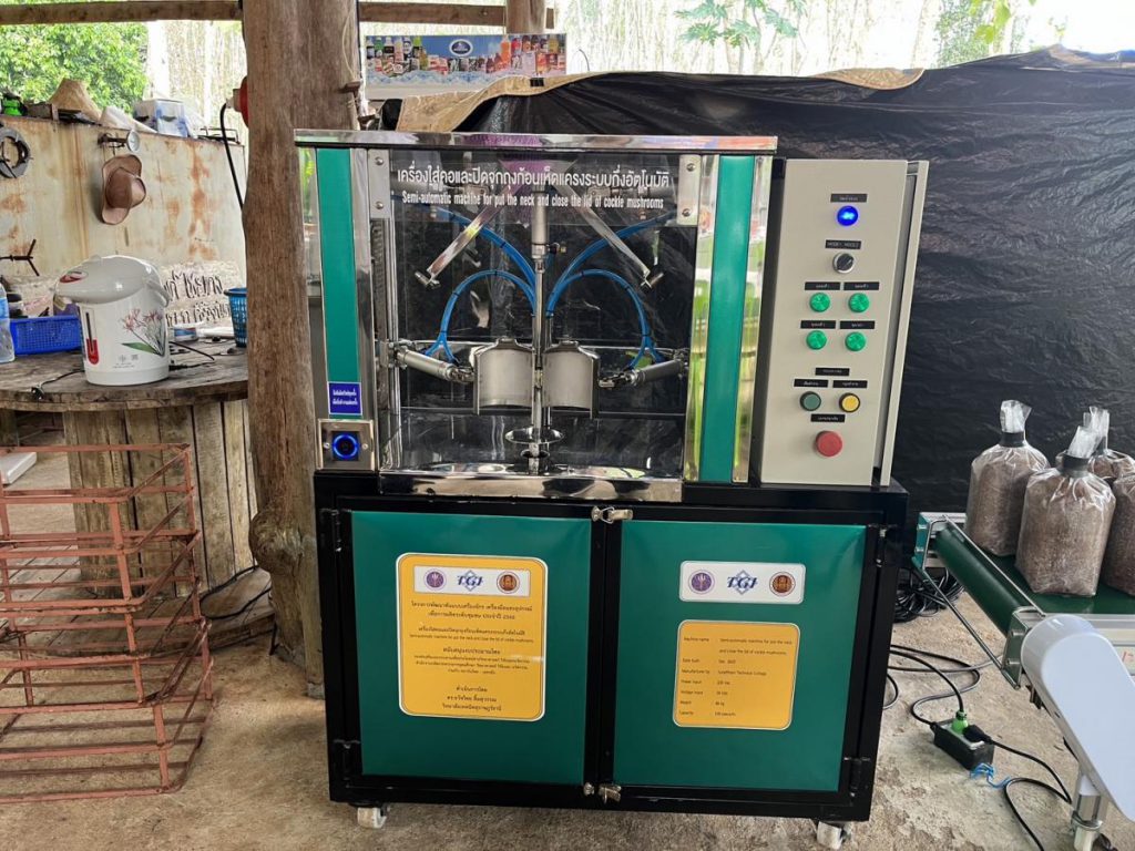 วิสาหกิจชุมชนคีรีรักษ์เกษตรยั่งยืน เป็นวิสาหกิจชุมชนฯ ที่ดำเนินกิจการเพาะเห็ดมานานกว่า 7 ปี เช่น เห็ดนางฟ้า เห็ดหูหนู เห็ดหลินจือ เห็ดขอนขาว และเห็ดแครง ปัจจุบันเห็ดแครงเป็นพืชเศรษฐกิจที่สามารถสร้างรายได้ให้กับวิสาหกิจชุมชนฯ โดยเห็ดแครงสดมีราคาจำหน่ายกิโลกรัมละ 250 บาท เห็ดแครงอบแห้งที่บรรจุภัณฑ์จำหน่ายกิโลกรัมละ 1,200 – 1,500 บาท จากการศึกษากระบวนการผลิตในส่วนของการใส่คอและปิดจุกถุงก้อนเห็ดแครง เมื่อบรรจุวัตถุดิบใส่ถุงแล้วต้องทำให้วัตถุดิบในถุงแน่นโดยการกระแทกก้นถุงกับโต๊ะหรือขอนไม้ ใส่วัสดุคอถุง ดึงปากถุงด้วยแรงรอบๆ เพื่อให้ปากถุงแน่นและตึง มืออีกข้างดึงปลายถุงพลาสติกรอบๆคอถุง และนำฝาจุกปิดคอ ซึ่งกระบวนการเหล่านี้ต้องใช้แรงงานคน 4 – 5 คน ทั้งยังทำให้เกิดอาการเจ็บปวดที่นิ้วและข้อมือ จึงทำให้เป็นขั้นตอนที่ลำบากและมีต้นทุนการผลิตสูงเครื่องใส่คอและปิดจุกถุงก้อนเห็ดแครงระบบกึ่งอัตโนมัติมีขั้นตอนการทำงาน โดยเริ่มจากผู้ใช้ใส่คอบนปากถุงและนำก้อนเห็ดเข้าสู่เครื่อง เครื่องจะทำงานโดยมีกลไก 3 ชุด ที่ควบคุมด้วยระบบนิวเมติก ประกอบด้วยชุดที่ 1 สำหรับบีบอัดถุงก้อนเห็ดให้แน่น ชุดที่ 2 กดที่คอถุงก้อนเห็ด และชุดที่ 3 สำหรับจับส่วนบนของปลายถุงเพื่อประคองถุงก้อนเห็ดขณะกดกลไกชุดที่ 2 เพื่อรัดที่คอถุงเห็ดให้แน่น ซึ่งใช้ระบบลมเป็นต้นกำลังสำหรับกดอัดวัสดุเพาะเห็ดเพื่อให้สามารถกดอัดด้วยแรงสม่ำเสมอ (พลังไฟฟ้า 1 kW)เครื่องใส่คอและปิดจุกถุงก้อนเห็ดแครงฯ สามารถเพิ่มกำลังการผลิตจากวันละ 200 ก้อน เป็น 100 ก้อนต่อชั่วโมง โดยใช้พลังไฟฟ้า 1 kW อัตรา 50 บาท/วัน หลังจากวิสาหกิจชุมชนฯ ทดสอบประสิทธิภาพการใช้เครื่องจักรแล้ว เป็นที่พึงพอใจอย่างมาก เนื่องจากสามารถตอบโจทย์ความต้องการของวิสาหกิจชุมชนฯ ได้ สามารถลดระยะเวลาการทำงาน เพิ่มผลผลิตให้เพียงพอต่อความต้องการของตลาดเห็ดแครงได้