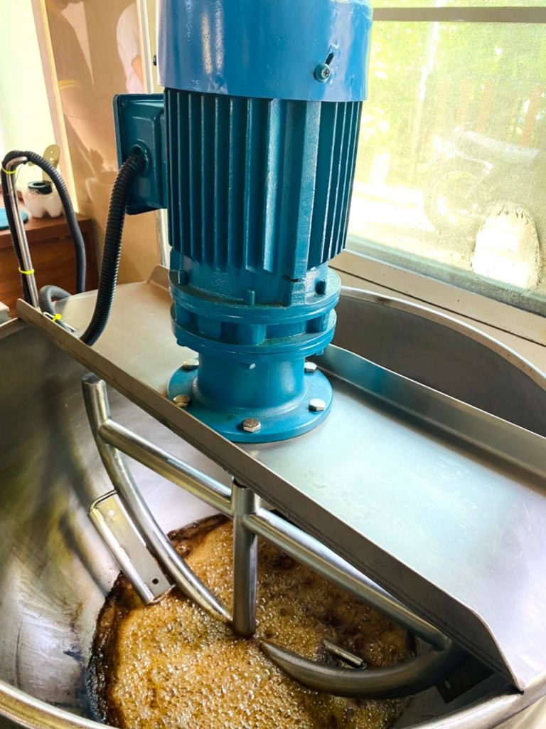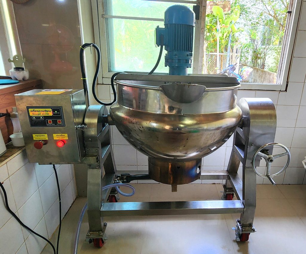 กระบวนการทำตังเมกรอบ พบว่าในการกวนส่วนผสมให้เป็นเนื้อเดียวกัน และการดึงหรือยืดตังเมให้มีสีขาวนวล ต้องใช้แรงงานคนจำนวนมากและพละกำลังในการทำงานสูง ทำให้มีอาการปวดเมื่อย ผลผลิตที่ได้ไม่เพียงพอต่อความต้องการของลูกค้า เครื่องทำตังเมกรอบเป็นเทคโนโลยีหนึ่งที่สามารถช่วยทุ่นแรงในการทำงานได้ ประกอบด้วยชุดหม้อกวนวัตถุดิบและชุดยืดตังเม มีหลักการทำงานคือนำส่วนผสมต่าง ๆ ใส่หม้อกวนผสมให้ความร้อนจากแก๊สหุงต้มและหมุนกวนวัตถุดิบด้วยมอเตอร์ เมื่อกวนผสมจนมีลักษณะข้นหนืด หมุนแขนยกหม้อกวนเพื่อเทส่วนผสมลงถาด นำไปวางในระบบน้ำหล่อเย็นซึ่งติดตั้งอยู่กับตัวเครื่องยืดตังเมกรอบ ทำการหล่อเย็นเพื่อให้ตังเมจับตัวเป็นก้อน จากนั้นนำขึ้นแกนหมุนประกอบด้วย 2 แกน และแกนหลักอีก 1 แกน เพื่อดึงหรือยืดตังเมจนมีลักษณะสีขาวนวล จากนั้นนำไปดึงให้เป็นเส้นและตัดเป็นแท่งรอการบรรจุต่อไป โดยมีประสิทธิภาพกำลังการผลิตที่ 4 กิโลกรัมต่อครั้ง