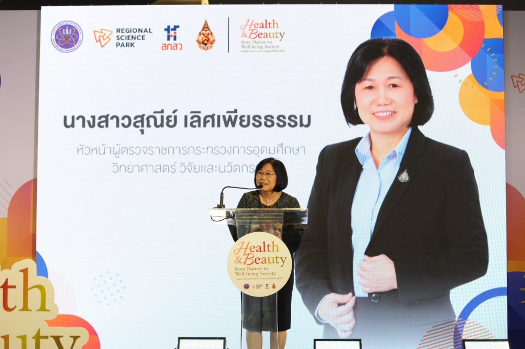 เมื่อวันที่ 13 มีนาคม 2567 นางสาวสุณีย์ เลิศเพียรธรรม หัวหน้าผู้ตรวจราชการกระทรวงการอุดมศึกษา วิทยาศาสตร์ วิจัยและนวัตกรรม กล่าวเปิดงาน Health & Beauty from Nature to Well-being Society | นวัตกรรมสุขภาพและความงามจากธรรมชาติเพื่อสังคมที่ยั่งยืน โดยมี ดร.ชลิดา ธนินกุลภรณ์ เป็นผู้กล่าวรายงานและต้อนรับแขกผู้มีเกียรติ จากตัวแทนอุทยานวิทยาศาสตร์ภูมิภาค สถาบันศึกษา และภาคเอกชน