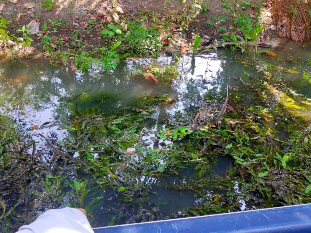 จากการสำรวจพื้นที่คลองระยะทางประมาณ 1 กิโลเมตร พบว่าร่องน้ำมีความลึกไม่เกิน 1.5 เมตร ความกว้างลำน้ำประมาณ 2 – 4 เมตร คุณภาพน้ำโดยรวมมีความใสสะอาด พบปลาหลายชนิด และพบการแพร่กระจายตัวของพืชน้ำ เช่น ดีปลีน้ำและเทปน้ำ โดยมีความหนาแน่นในระดับมาก เป็นปัญหาปิดกั้นช่องทางสัญจรทางน้ำ ทำให้เรือเคลื่อนผ่านได้ยากและอาจส่งผลให้เกิดการสะสมทำให้น้ำเน่าเสียได้ ที่ผ่านมาการบำรุงรักษาความสะอาดลำคลองดำเนินการโดยองค์การบริหารส่วนตำบลฯ โดยประสานผ่านผู้นำชุมชน ใช้แรงงานจิตอาสาประมาณ 60-70 คน ในการเก็บกวาดวัชพืชน้ำเดือนละครั้ง ใช้เวลาประมาณ 3-5 ชั่วโมง จำเป็นต้องทำต่อเนื่องเป็นประจำทุกเดือนตลอดทั้งปี ในระยะยาวการพึ่งแรงงานจิตอาสาอาจไม่สม่ำเสมอ เนื่องด้วยข้อจำกัดต่างๆ จึงมีแนวคิดในการพิจารณาเครื่องมือเพื่อช่วยทุ่นแรง หรือเครื่องจักรที่เหมาะสมสำหรับการดำเนินงาน ดังกล่าว