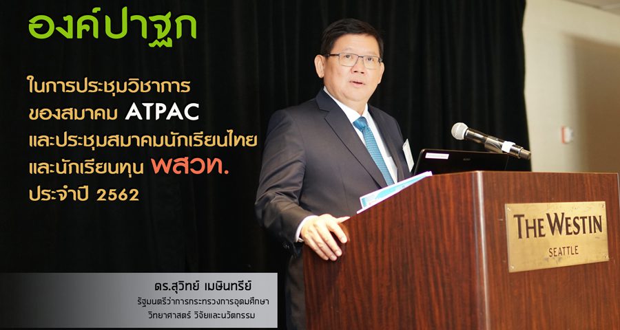 6 กันยายน 2562 : ดร. สุวิทย์ เมษินทรีย์ รัฐมนตรีว่าการกระทรวงการอุดมศึกษา วิทยาศาสตร์ วิจัยและนวัตกรรม (อว.) ได้รับเชิญจากสมาคมนักวิชาชีพไทยในสหรัฐอเมริกาและแคนาดา (The Association of Thai Professionals in America and Canada: ATPAC) เป็นประธานและองค์ปาฐกในการประชุมวิชาการของสมาคม ATPAC และการประชุมสมาคมนักเรียนไทยและนักเรียนทุน พสวท. ประจำปี 2562 ณ เมืองซีแอตเทิล มลรัฐวอชิงตัน สหรัฐอเมริกา โดยมีผู้เข้าร่วมประชุมกว่า 100 คน ประกอบด้วย ผู้แทนหน่วยงานทั้งภาครัฐและเอกชน นักวิชาชีพไทยในสหรัฐอเมริกาและแคนาดา นักศึกษาไทยที่กำลังศึกษาอยู่ในสถาบันอุดมศึกษาของสหรัฐอเมริกาที่มาศึกษาโดยทุนรัฐบาลไทย ทุนส่วนตัว และทุนจากหน่วยงาน/มหาวิทยาลัยของไทยและต่างประเทศ