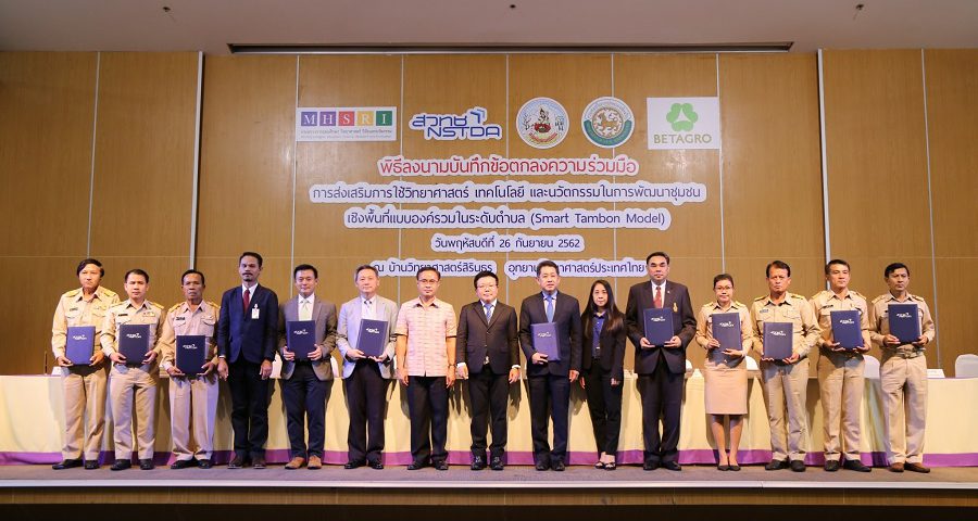 (26 กันยายน 2562): สวทช. ร่วมกับองค์กรปกครองส่วนท้องถิ่น กรมพัฒนาที่ดิน และเครือเบทาโกร ลงนามความร่วมมือเพื่อยกระดับการพัฒนาท้องถิ่นด้วยวิทยาศาสตร์ เทคโนโลยีและนวัตกรรม พัฒนาชุมชนเชิงพื้นที่แบบองค์รวม 5 ด้าน สร้างความรู้ ลดความเหลื่อมล้ำ นำร่องต้นแบบ 7 ตำบล 5 จังหวัด ภายใต้ “โครงการส่งเสริมการใช้วิทยาศาสตร์ เทคโนโลยี และนวัตกรรมในการพัฒนาชุมชนเชิงพื้นที่แบบองค์รวมในระดับตำบล: Smart Tambon” ณ ห้องออดิทอเรียม บ้านวิทยาศาสตร์สิรินธร อุทยานวิทยาศาสตร์ประเทศไทย